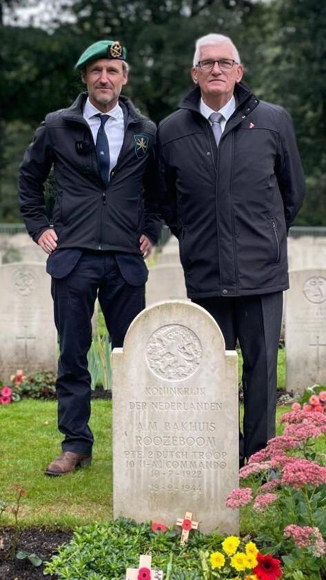 Foto: Martien van Barneveld jr. (rechts) en links staat Willem Bakhuis Roozeboom (achterneef van August) bij het graf van de August .M. Bakhuis Roozeboom, commando van de 2. Dutch Troop gevallen in de Slag om Arnhem op 19 september 1944.